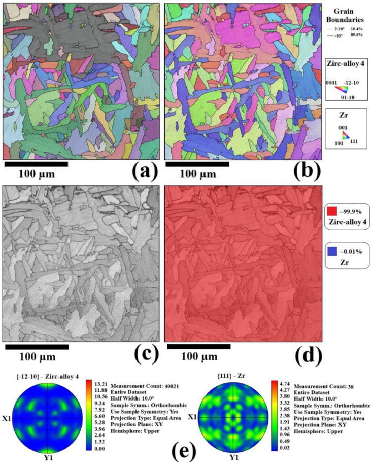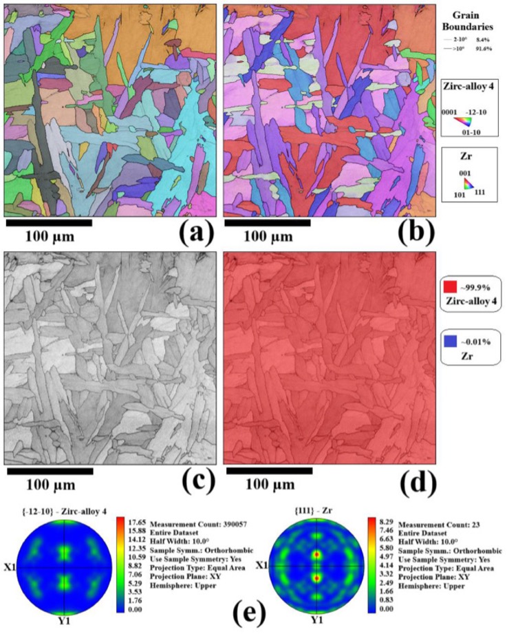 Fig. 9. The EBSD microstructural characterization results from the prepared weldment for the right-side weld-line: (a) Grain boundary map, (b) inverse pole-figure grain structure, (c) band contrast microstructure, (d) phase-color map, and (e) pole-figure textural plots regarding the <-12-10> Zircaloy-4 and <111> zirconium projections.