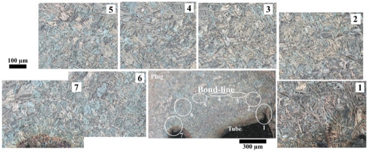 The microstructure of different locations in the heat affected zones (HAZ) around the produced solid-state weldment by optical microscopy imaging are depicted in Fig. 8, combined with the macro-profile of joints between tube and plug. As shown for eleven locations in this figure around the produced weldment, the microstructure of all HAZ regions retains an acicular lath structure, with some differences in structure between the rod and tube. The structure of all locations for the HAZ region appears to be a β-phase structure based on the EBSD indexing, similar to the bond-line, while the size of the lath structure and its needles varies based on location around the HAZ indicated with points one to eleven in Fig. 8, depending on the applied shear plastic strain and subsequent cooling action during and after IKW processing of the tube to plug joint due to a heat-sinking effect (Lippold, 2014). As shown, in the locations 3, 4, 5, and 8, toward the bottom part of the joint design, caused by likely a higher degree of plastic deformation and higher cooling rates, such that the needle-like β-phase structure of these regions seem finer than the other top and middle parts of the HAZ area.