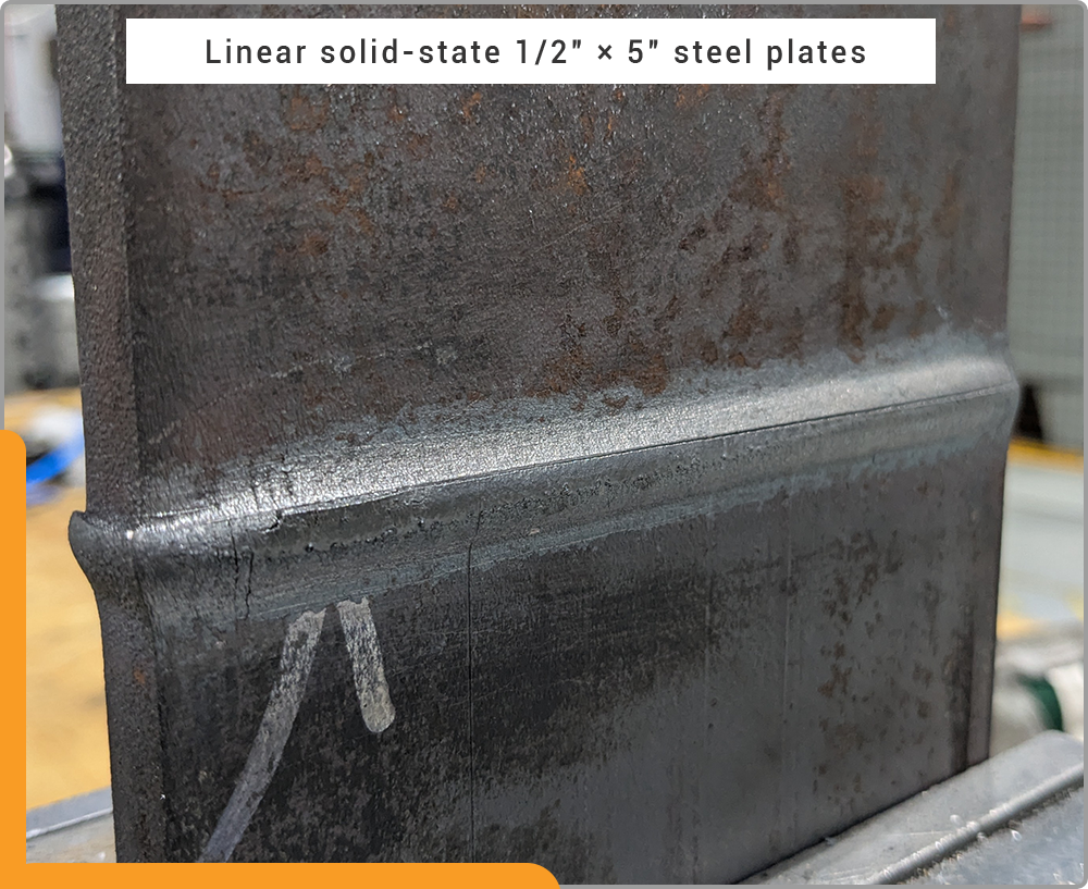FuseRing successfully demonstrated the solid-state joining of two ½” × 5” steel plates at below melting.